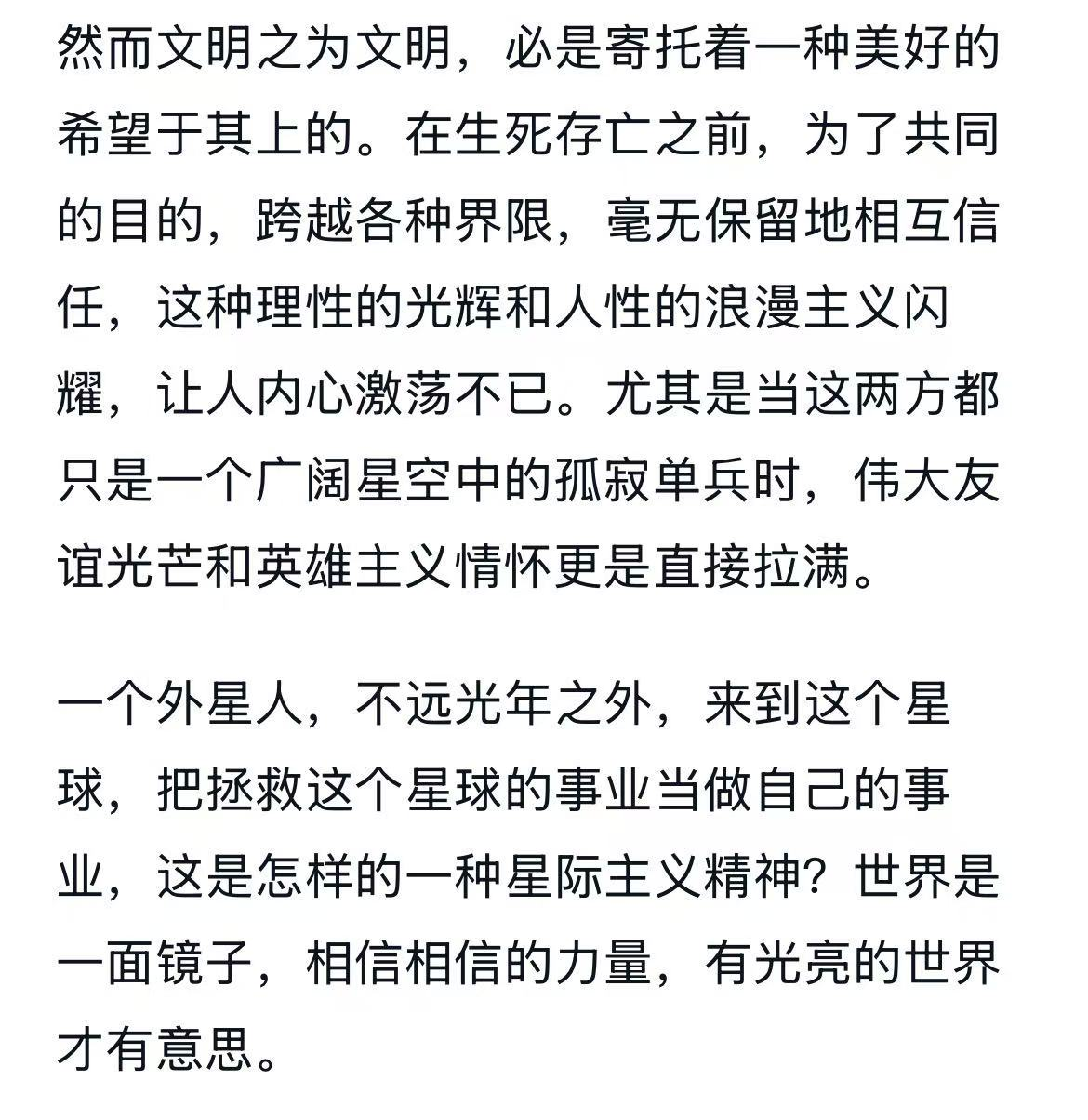风能吹走一张纸但吹不走一只蝴蝶,生命的力量在于不顺从,如此渺小的个体在如此宏大孤寂的宇宙中展现的力量,如果要遇到地外生命,聚焦个体之间的连接和共鸣,就能普惠到群体精神的欣欣向荣,关注远方还有其他生命真的很好。但蝴蝶可以卷起风暴,因为生命的意义在于不确定。如果他告诉我们,去自信地坦然地拥抱你所面对的不确定性,然后继续奔赴新的远方和未来,这也很好。即使要素陈旧结构老套而感觉没有诚意,即使是一种个人英雄主义和爆米花式消遣,但他也是一种难得的文艺复兴。